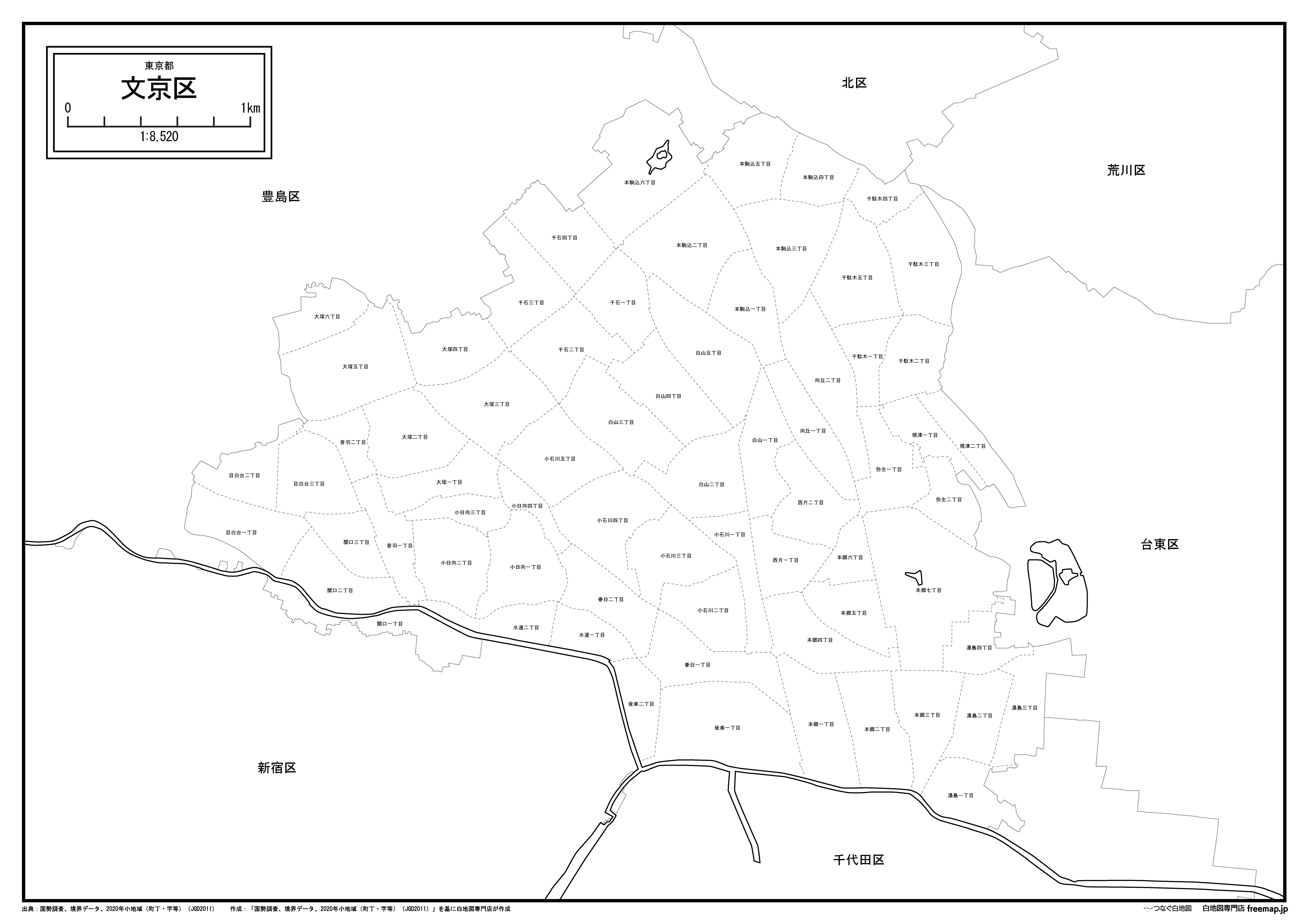 東京都文京区の町名(町丁目)も記載した地図データです。