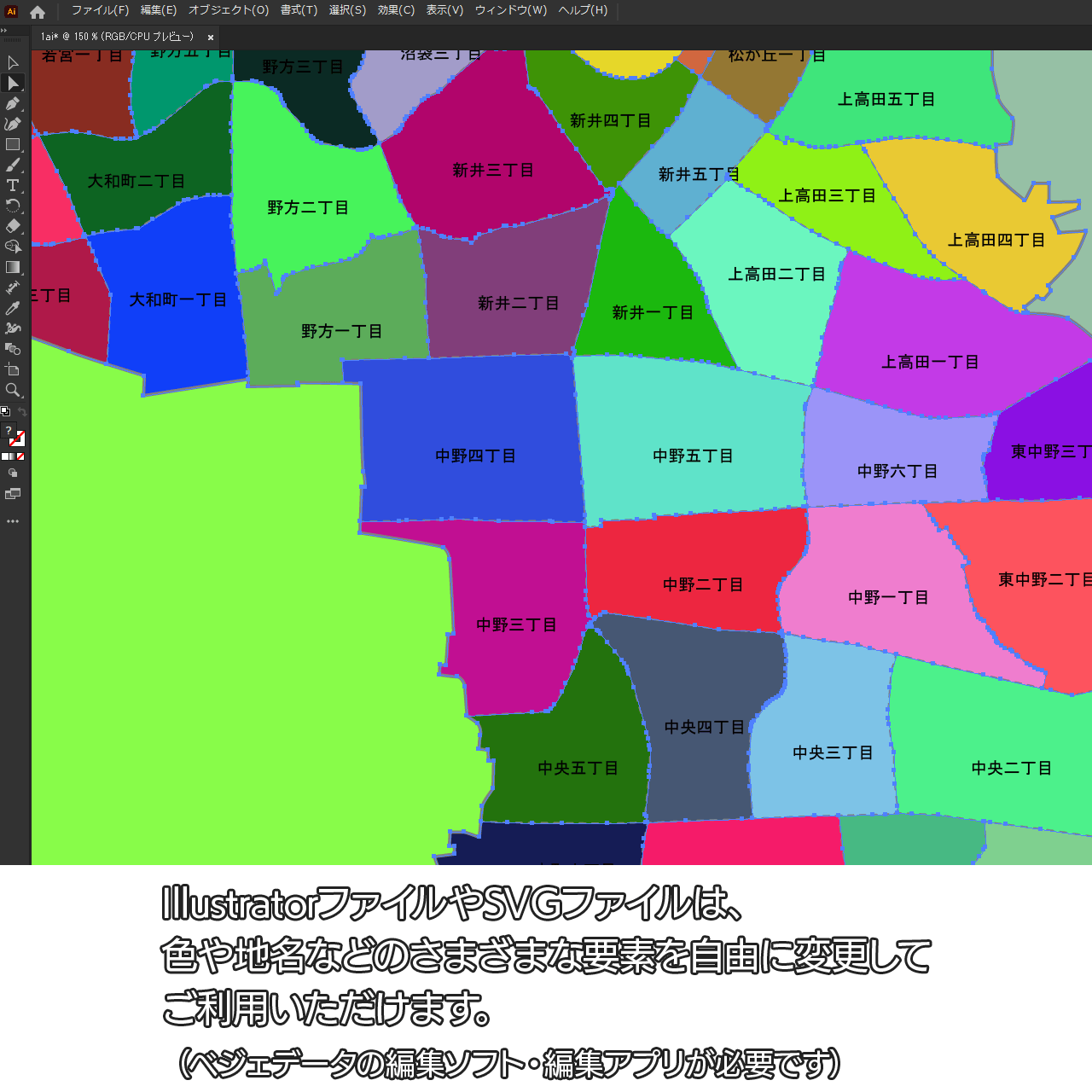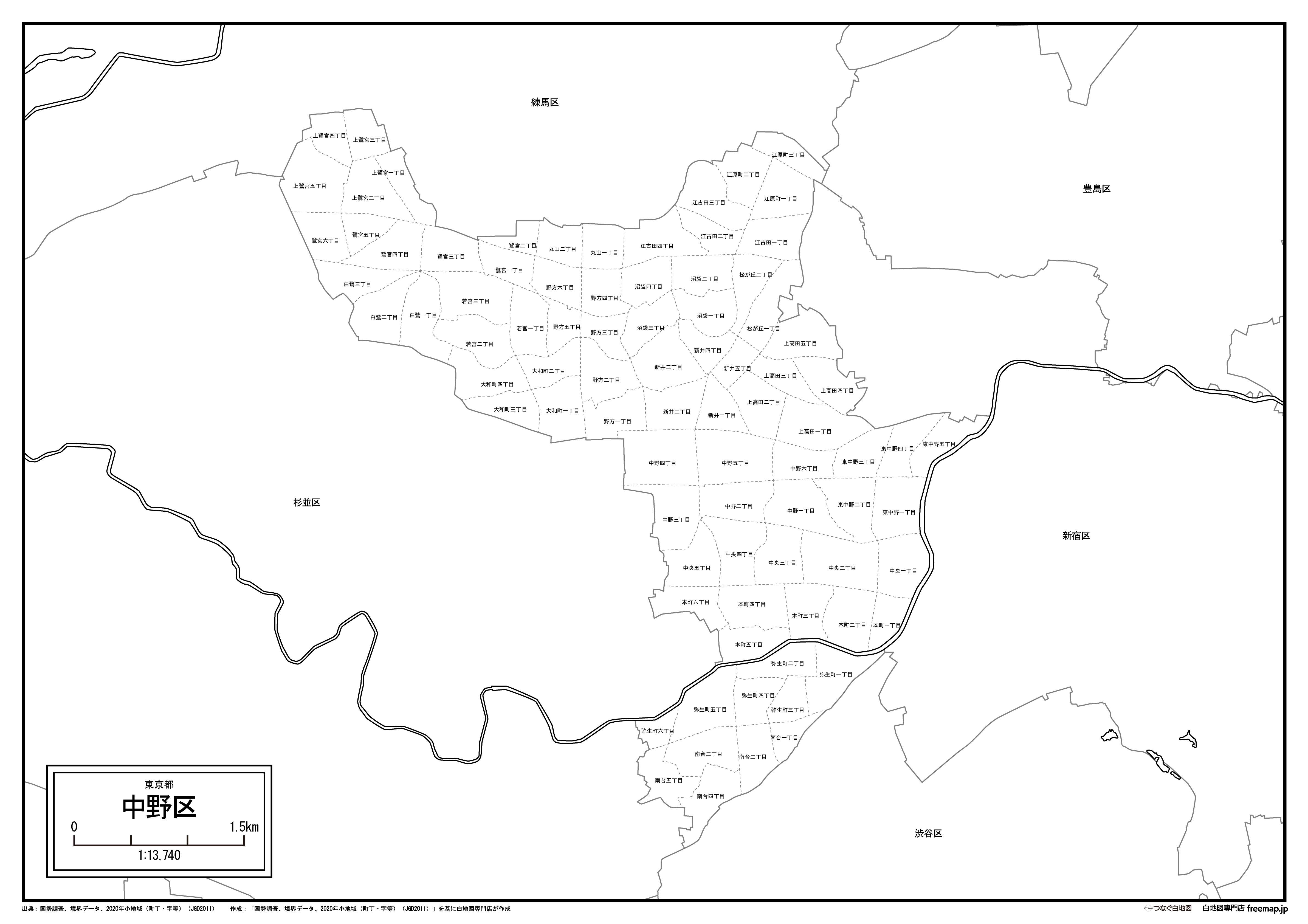 東京都中野区の町名(町丁目)も記載した地図データです。
