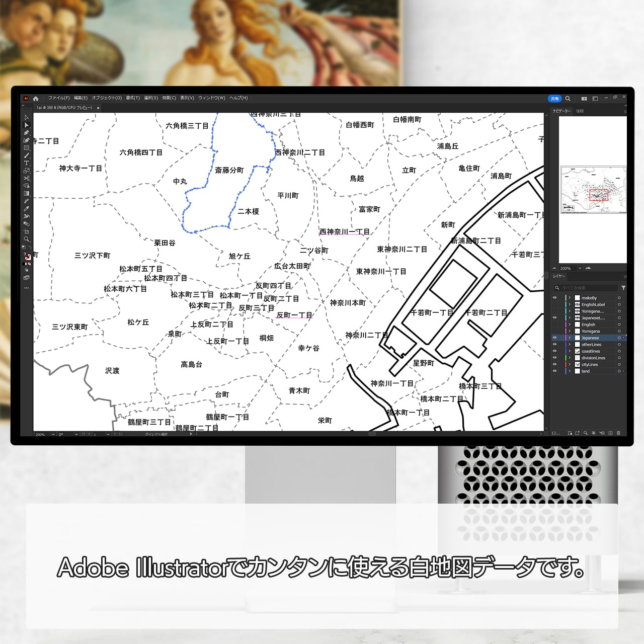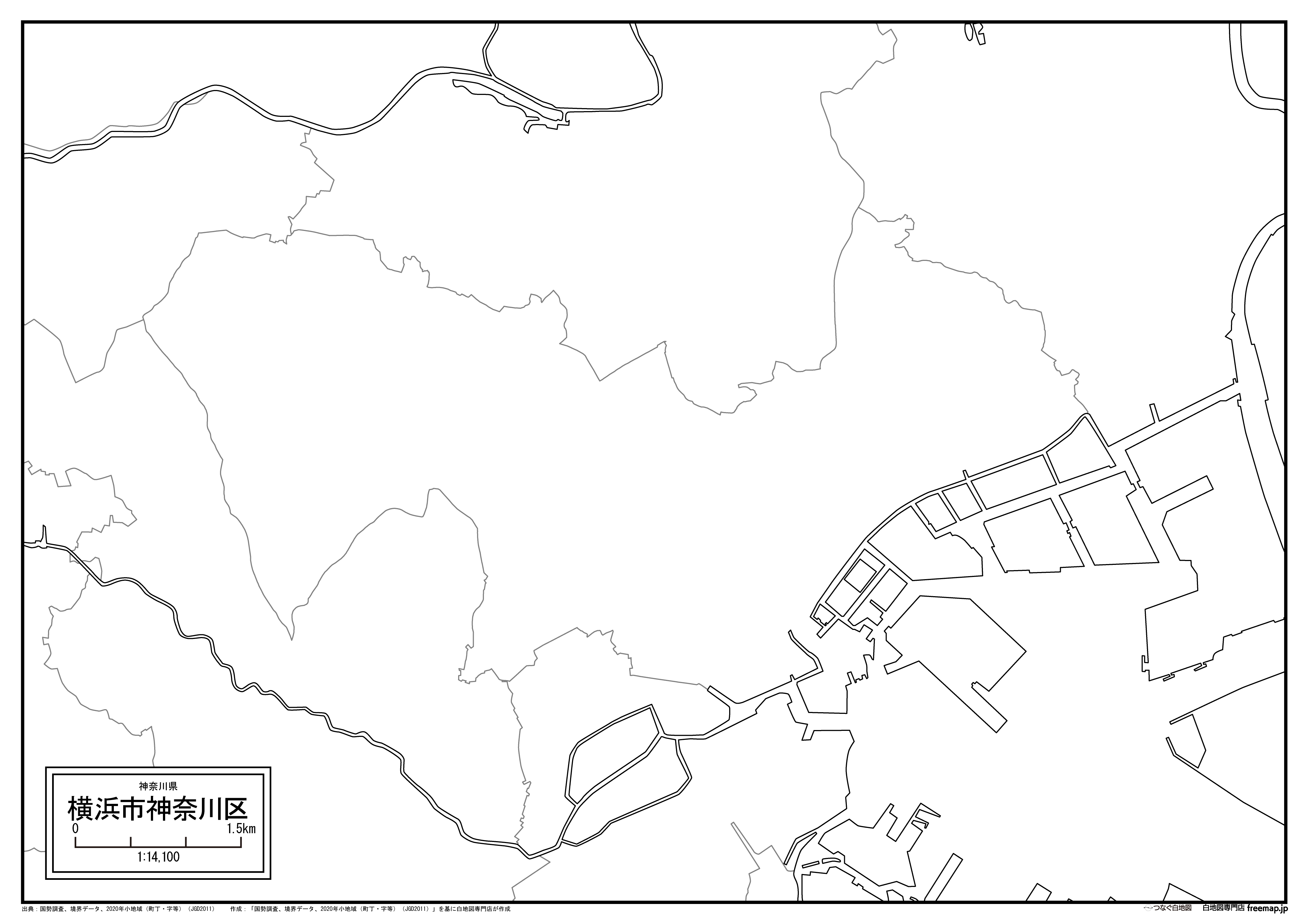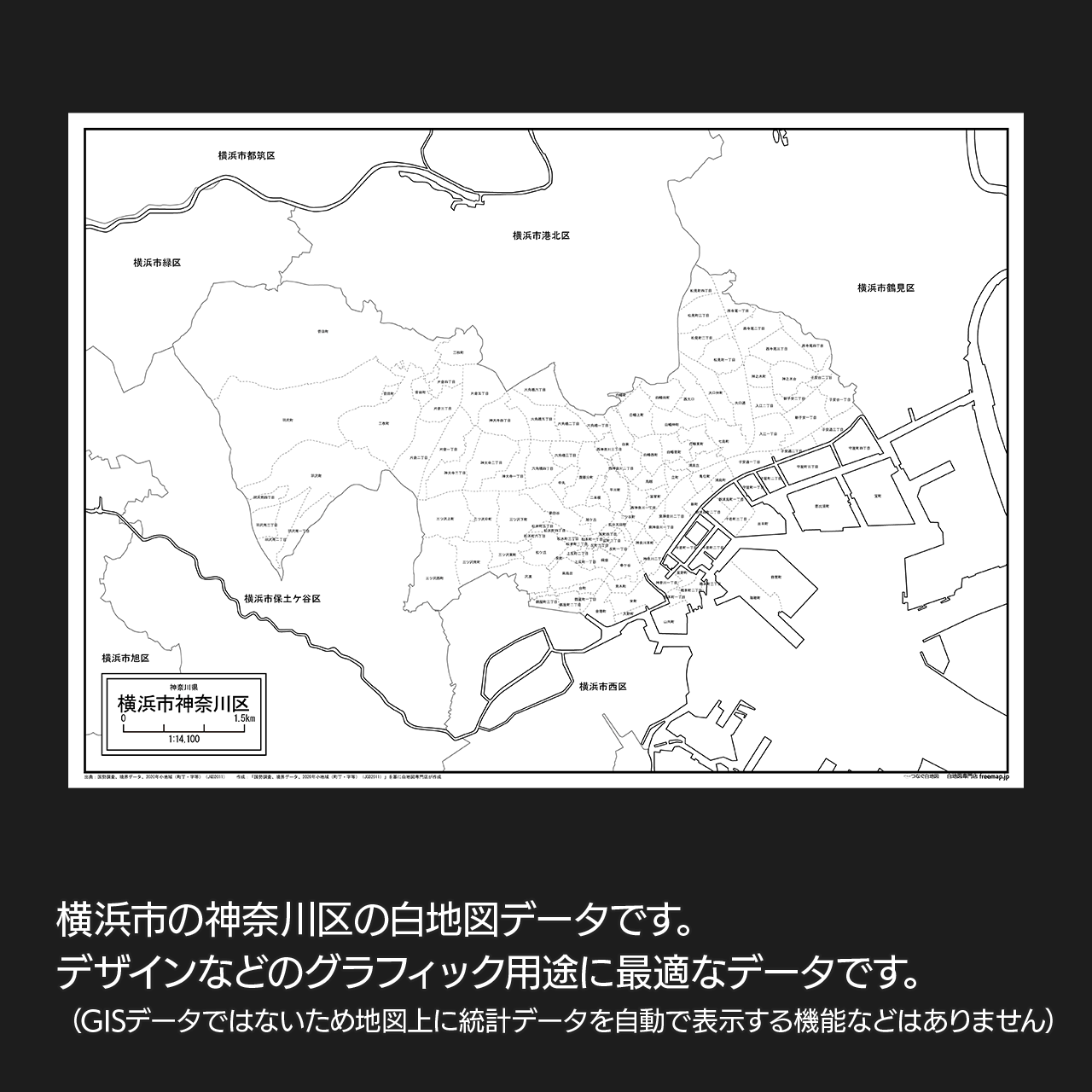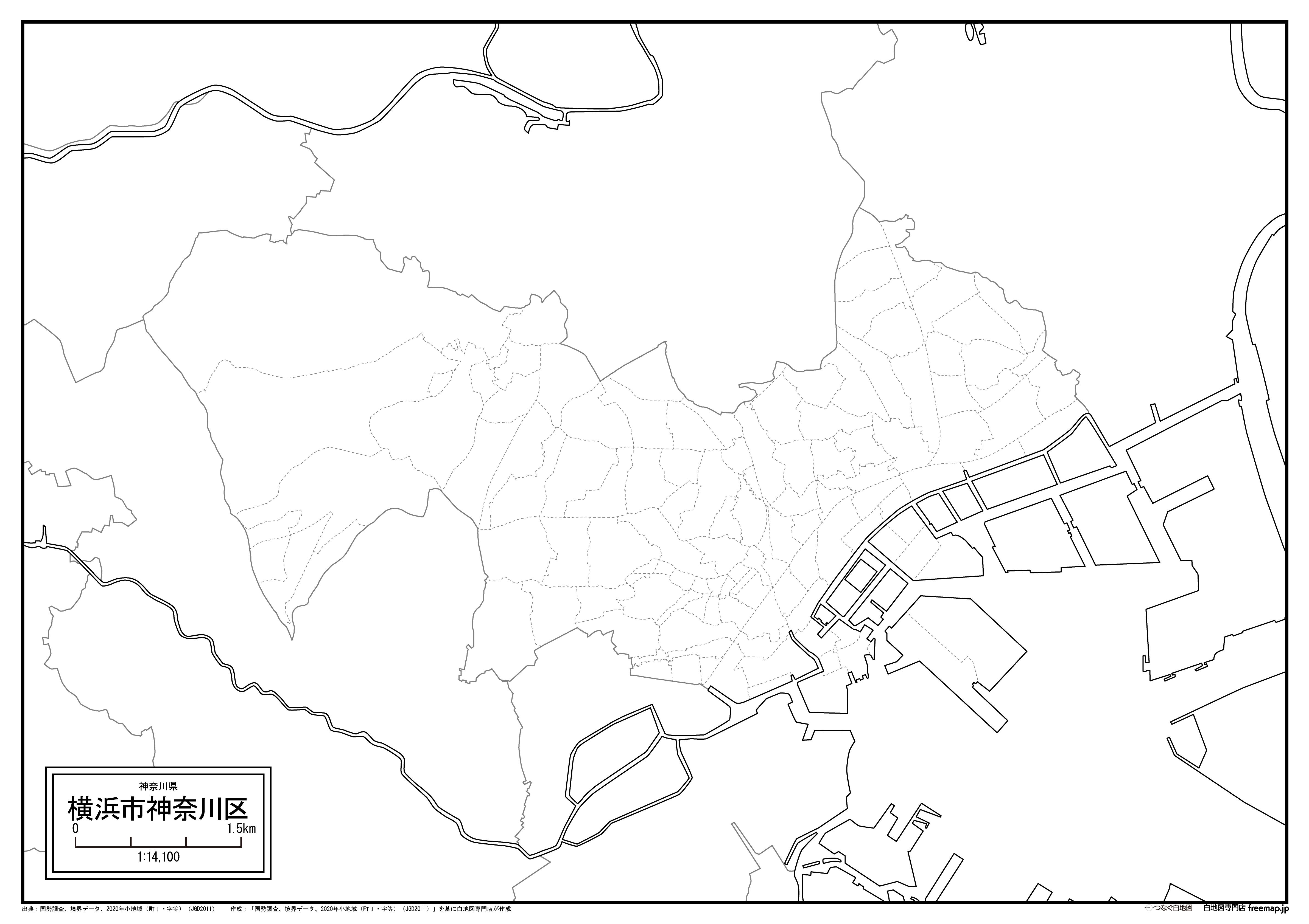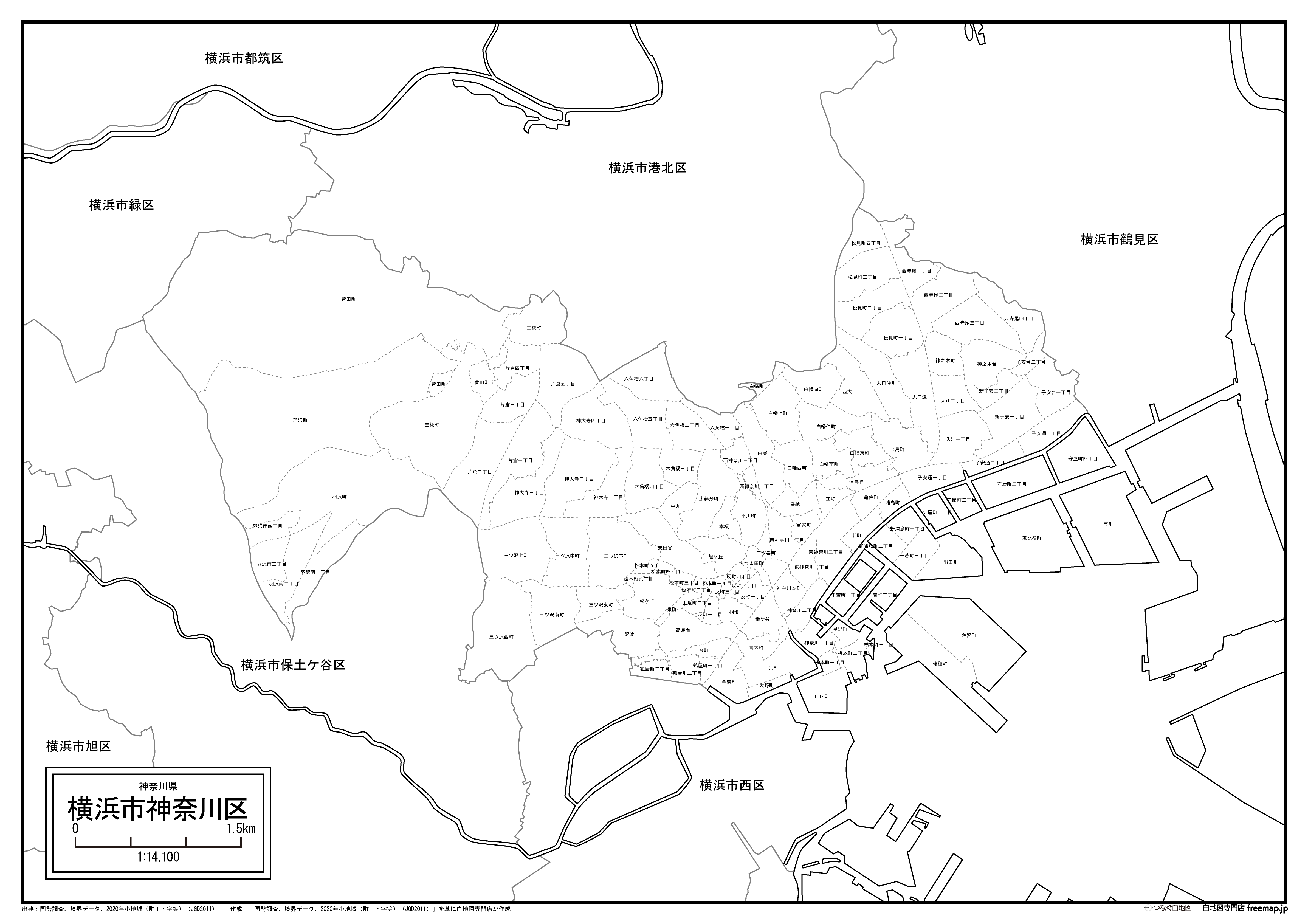 横浜市神奈川区の町名(町丁目)も記載した地図データです。