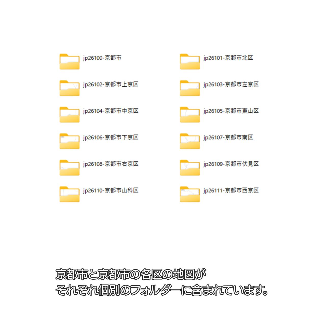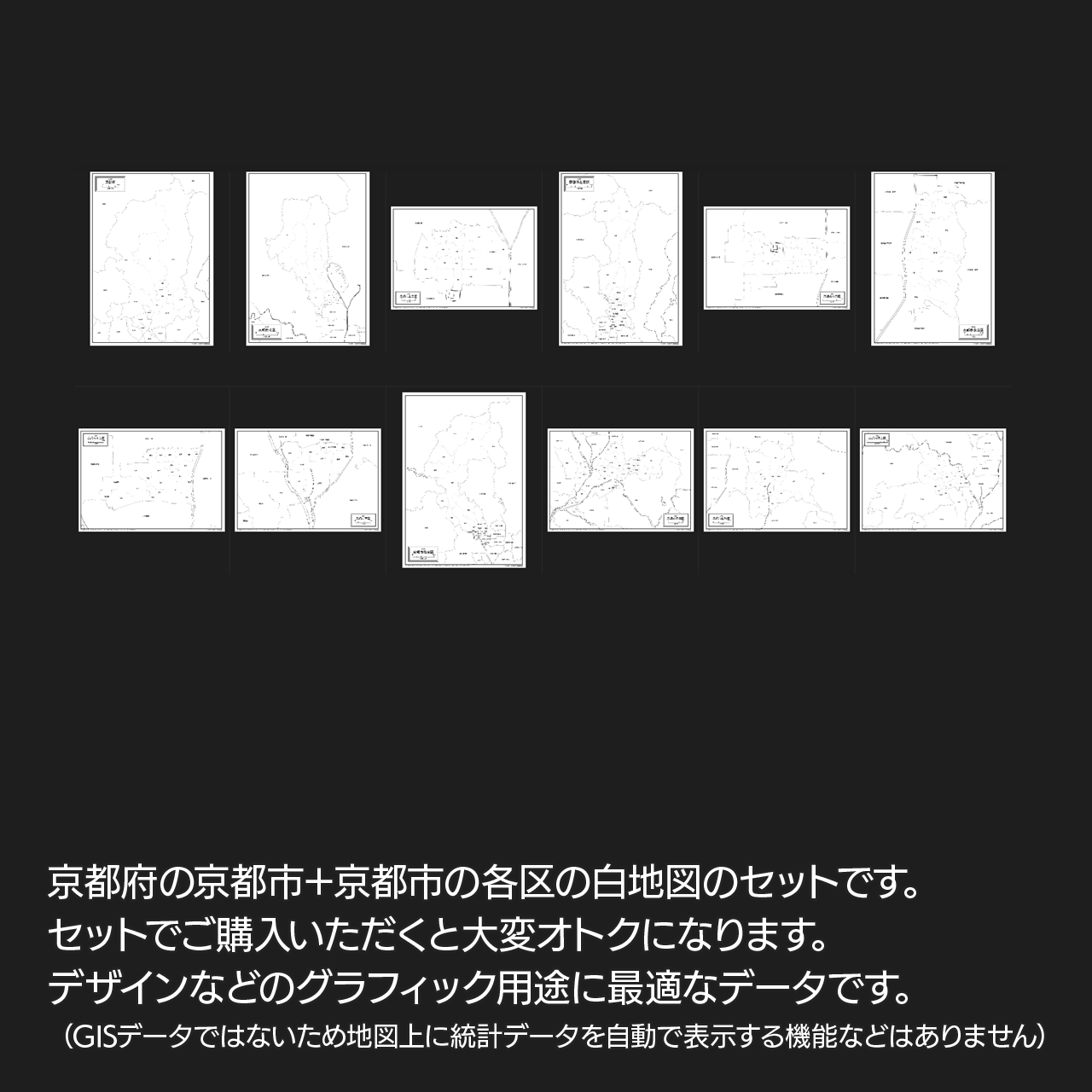 京都市と京都市の各11区の合計12エリアがセットになっているイラストレータ白地図データ集です。