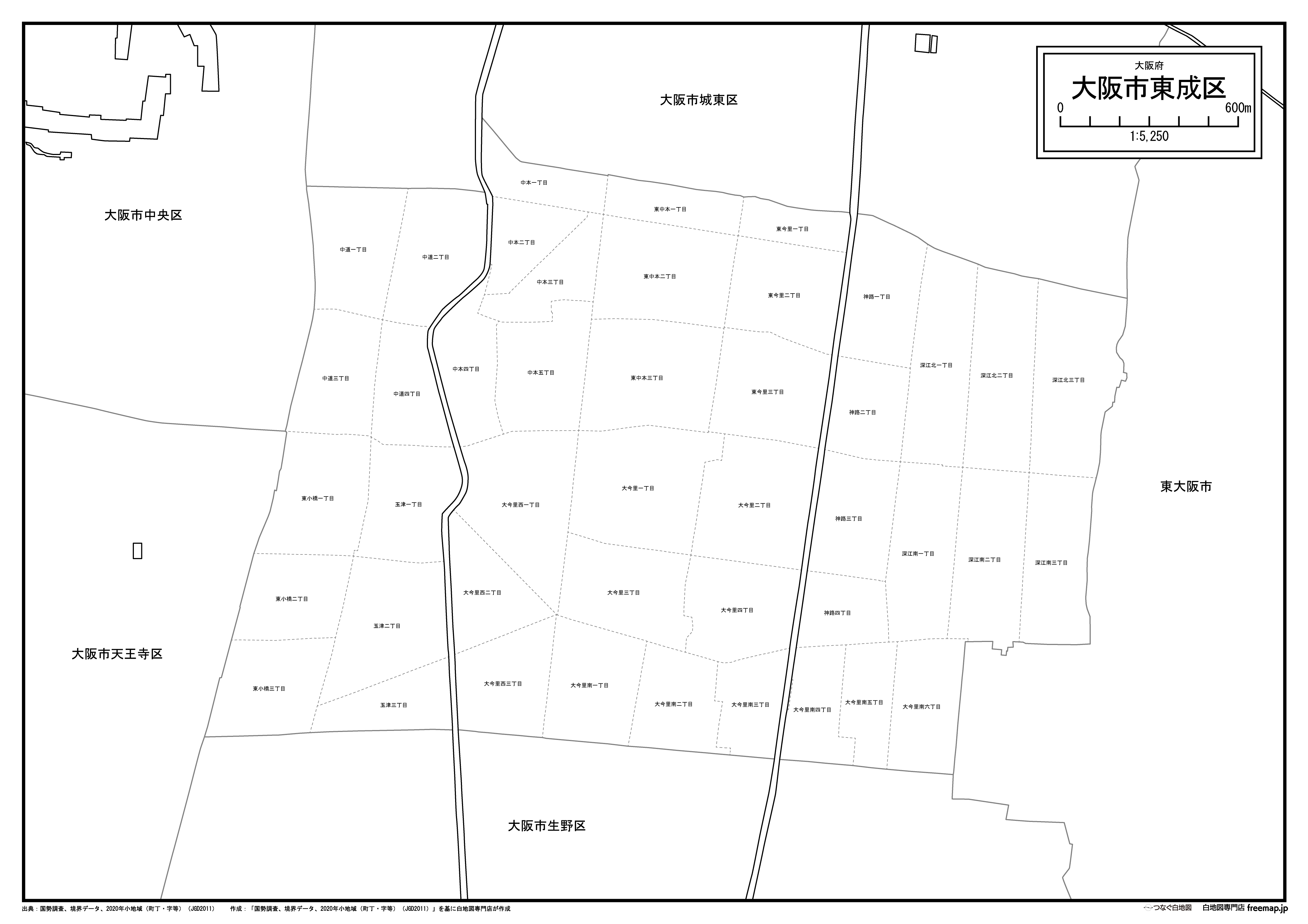 大阪市東成区の町名(町丁目)も記載した地図データです。