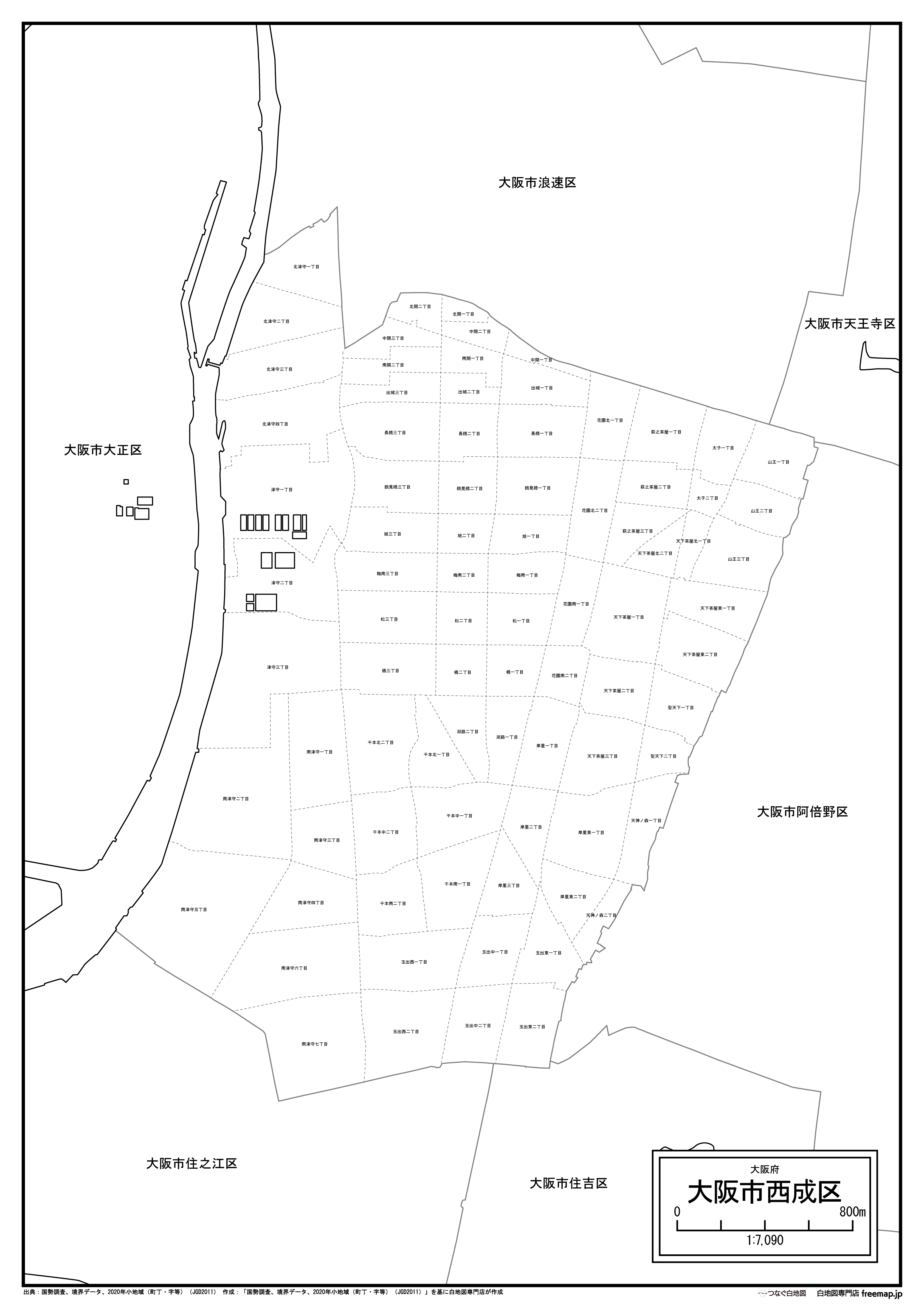 大阪市西成区の町名(町丁目)も記載した地図データです。