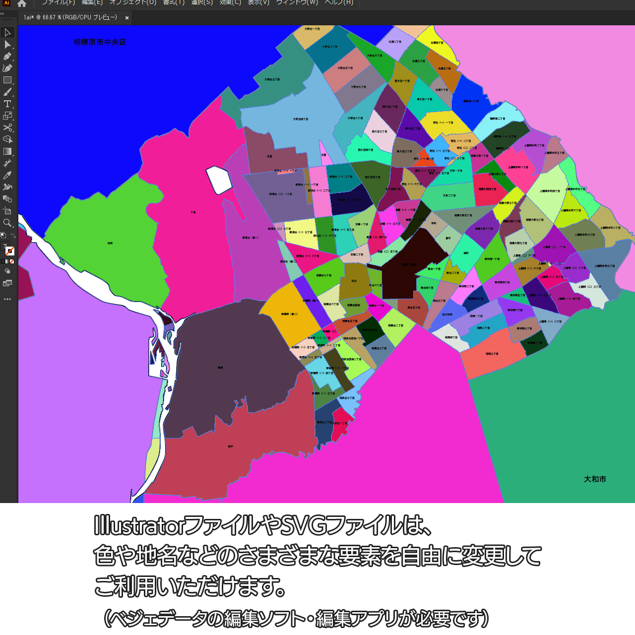 神奈川県相模原市と各3区がセットになった白地図データです。Illustratorで自由に再編集可能です。