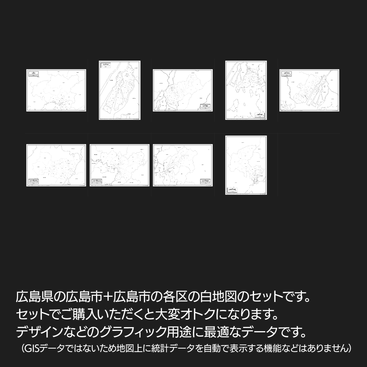 広島県広島市と広島市の各区の合計9エリアがセットになっているイラストレーター白地図データ集です。