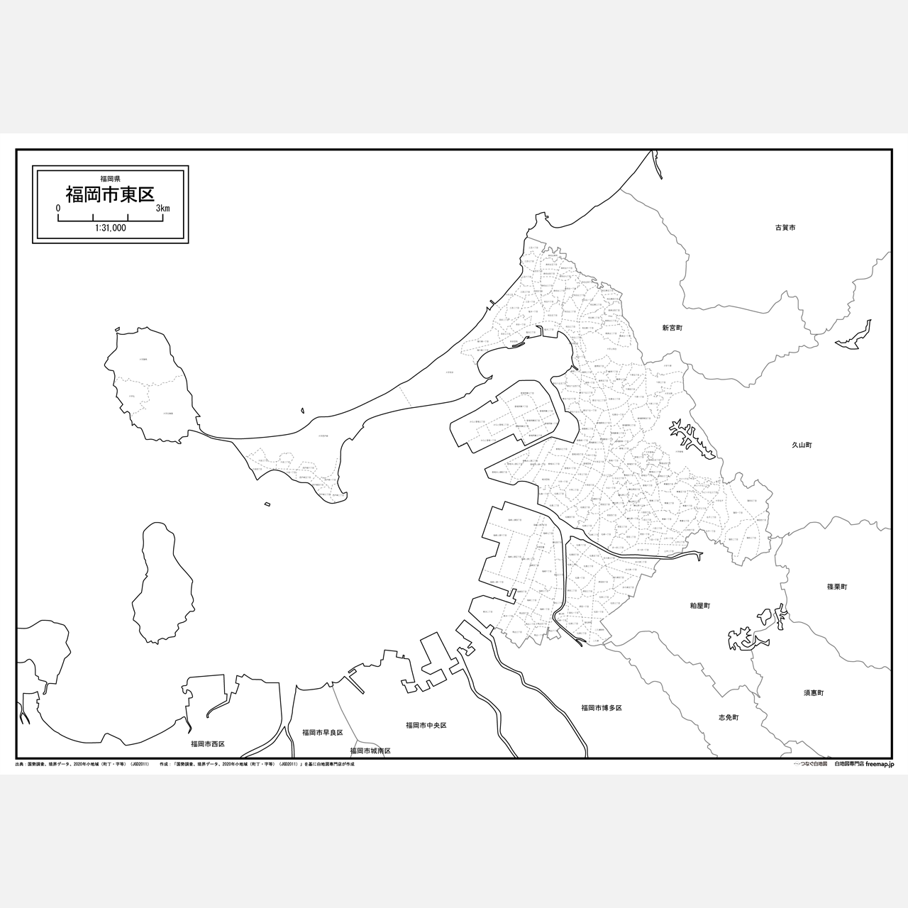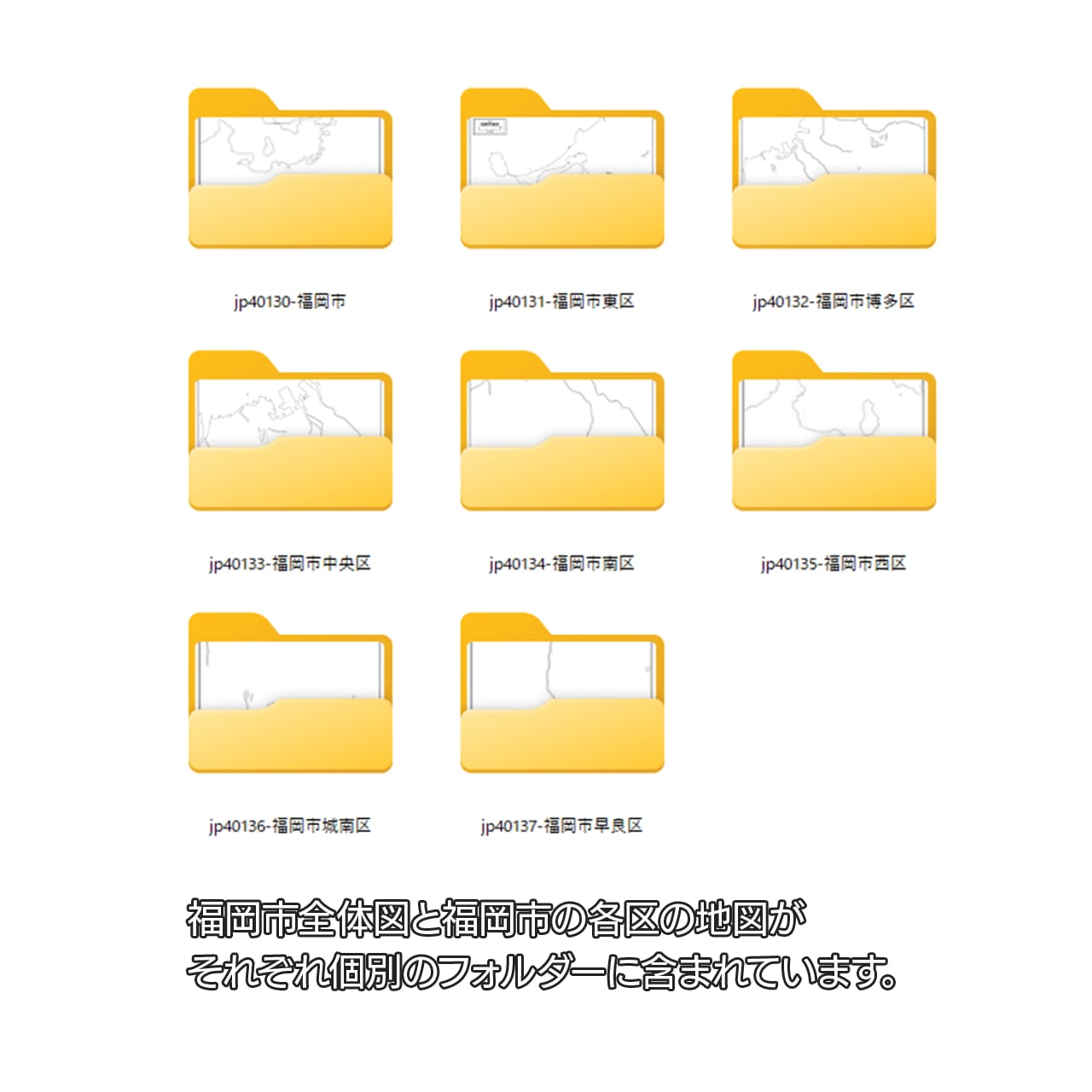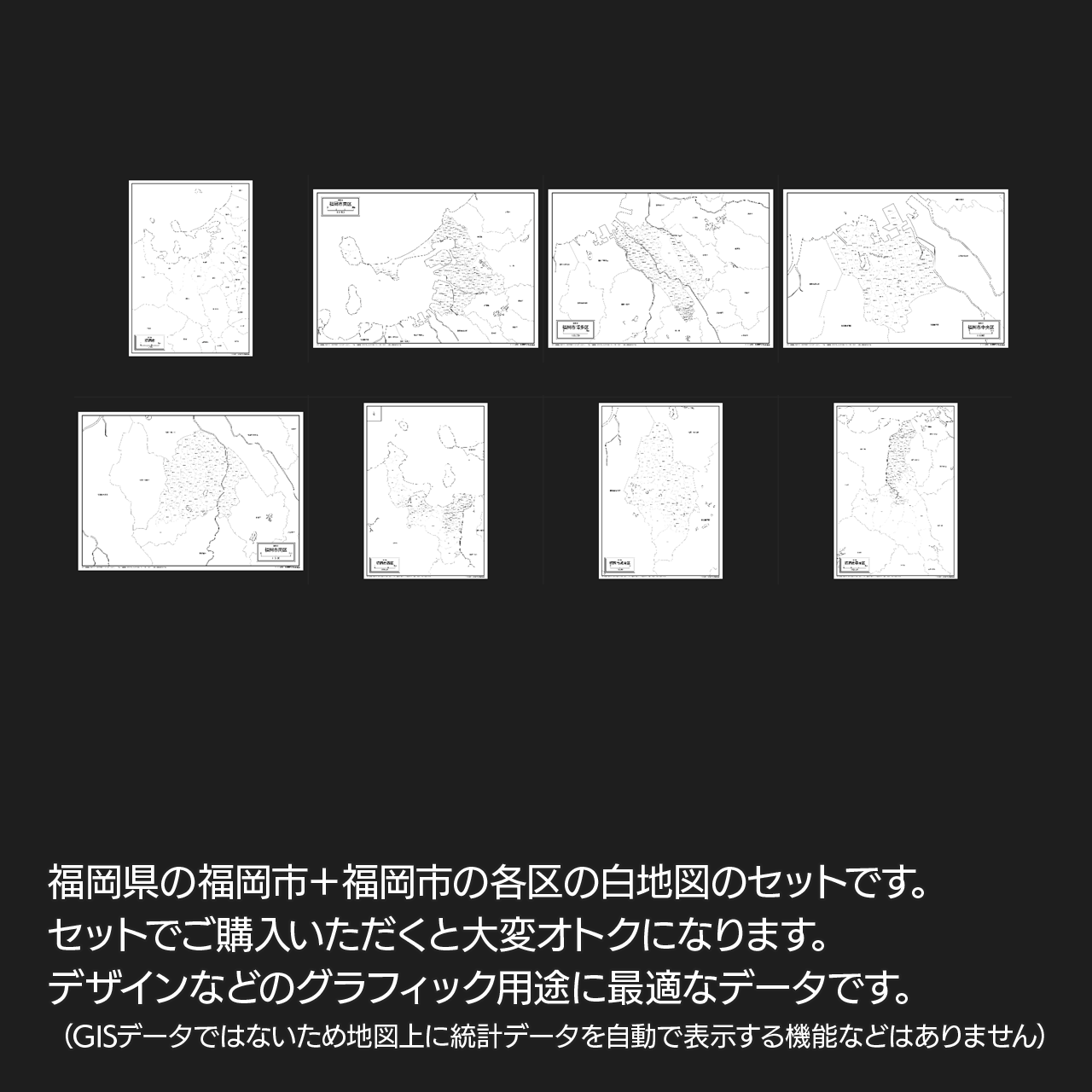 福岡県福岡市の全体図と各区の合計8エリアがセットになっているイラストレーター白地図データ集です。